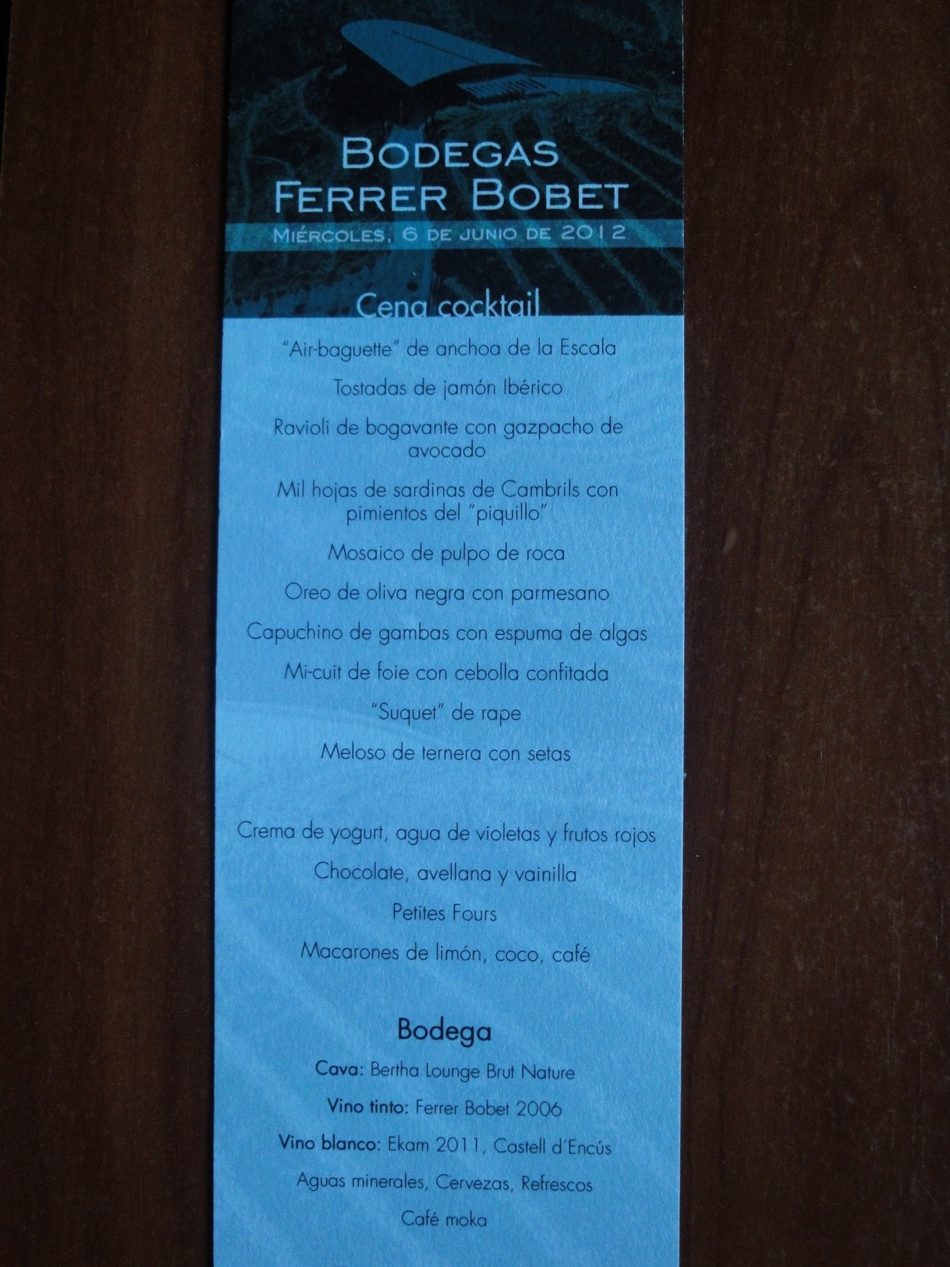 Tuve la suerte de asistir el 6 de junio pasado a una cena extraordinaria (por lo infrecuente y por la calidad), servida en la terraza con el atardecer al fondo sobre las montañas del Priorato. Solo por ver el atardecer vale la pena poner primera en el coche (si no es así, no sube) y remontar la muy empinada cuesta de acceso a la bodega.