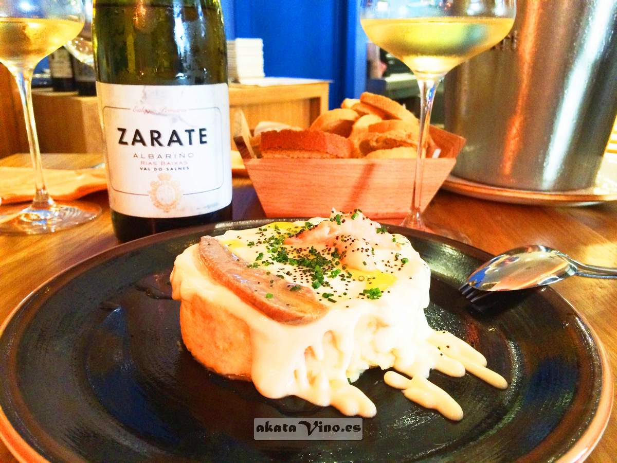 El Plato. Ensaladilla rusa de gambas y ventrasca de atún napada con mahonesa de oliva. Destacable la unión de las gambas de Málaga que posan en la cima y el caldo con el cuál están cocidas las patatas, amén de la textura y sabor de la mahonesa. Un plato con mucho sabor y a la vez para comerte un cubo, eh ahí su virtud, como aquel vino complejo y concentrado que no cansa debido a su acidez y frescura. El Vino. Zarate Albariño de Eulogio Pomares 2015. 93 puntos Guía AkataVino 2016-2017. Rías Baixas. Como bien versamos con el bueno de Antonio, es uno de los que siempre están en la Final Four, uno de los Champions. Un vino lleno de vida, intenso, fresco, con una endiablada acidez muy bien domada, ancho en boca, donde sus aromas nos traen recuerdos de hierbas de montebajo, de manzana, hinojo, boj.