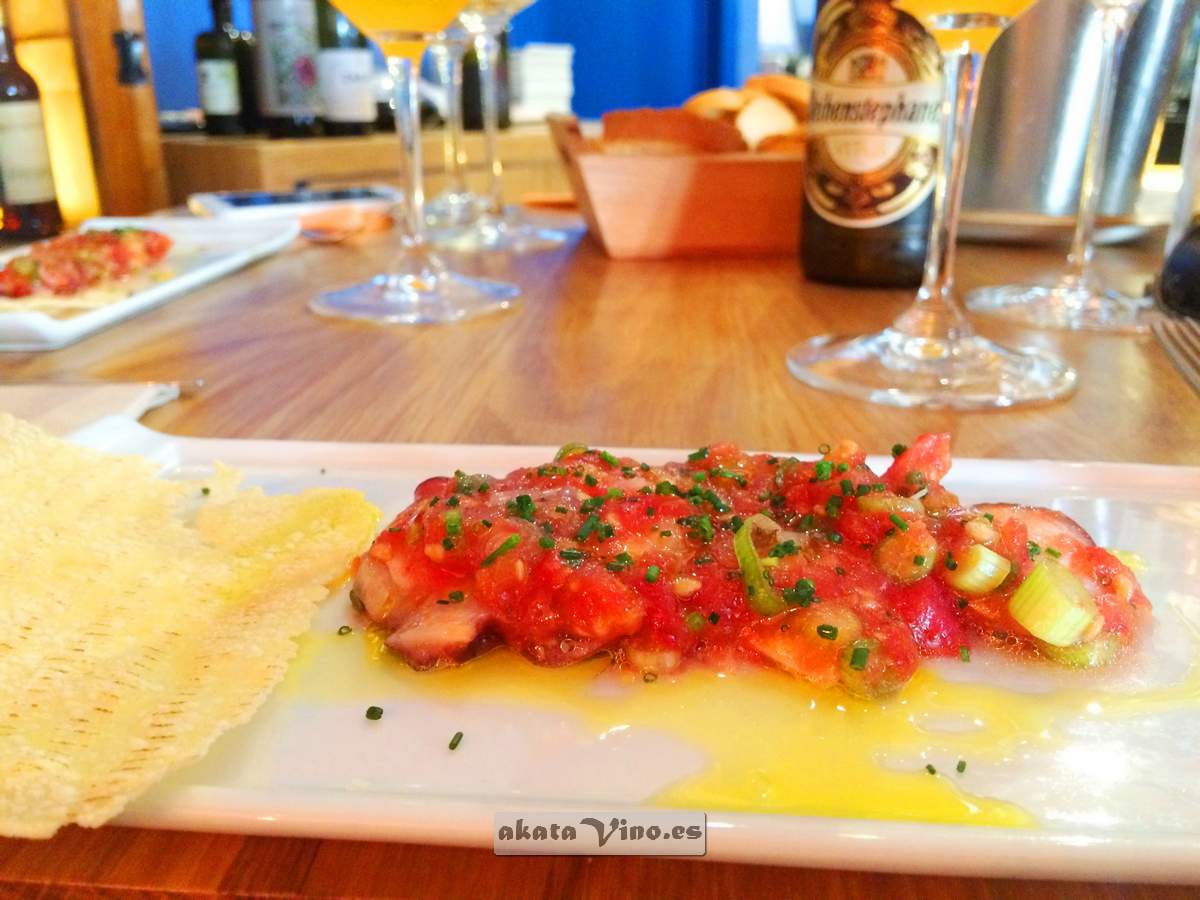 Plato. Pulpo Amtumaca. Acompañada con el Jamón, diríamos que todo un clásico, pero no, para clásicos ya hemos cubierto la cuota con la rusa. Se nos presenta con una tosta muy fina, ideal porque no se empapa y conserva su carácter crujiente, muy buena calidad del pulpo y el tomate.
