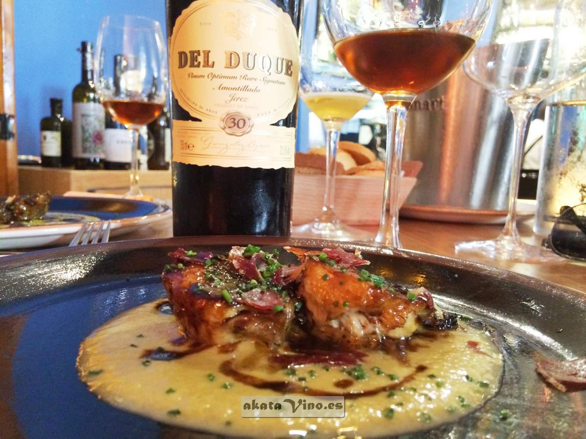 El Vino. Amontillado muy viejo DEL DUQUE de González Byass. Jerez. Este vino ha envejecido una media de 30 años en botas de roble americano (VORS -Very Old Rare Sherry).