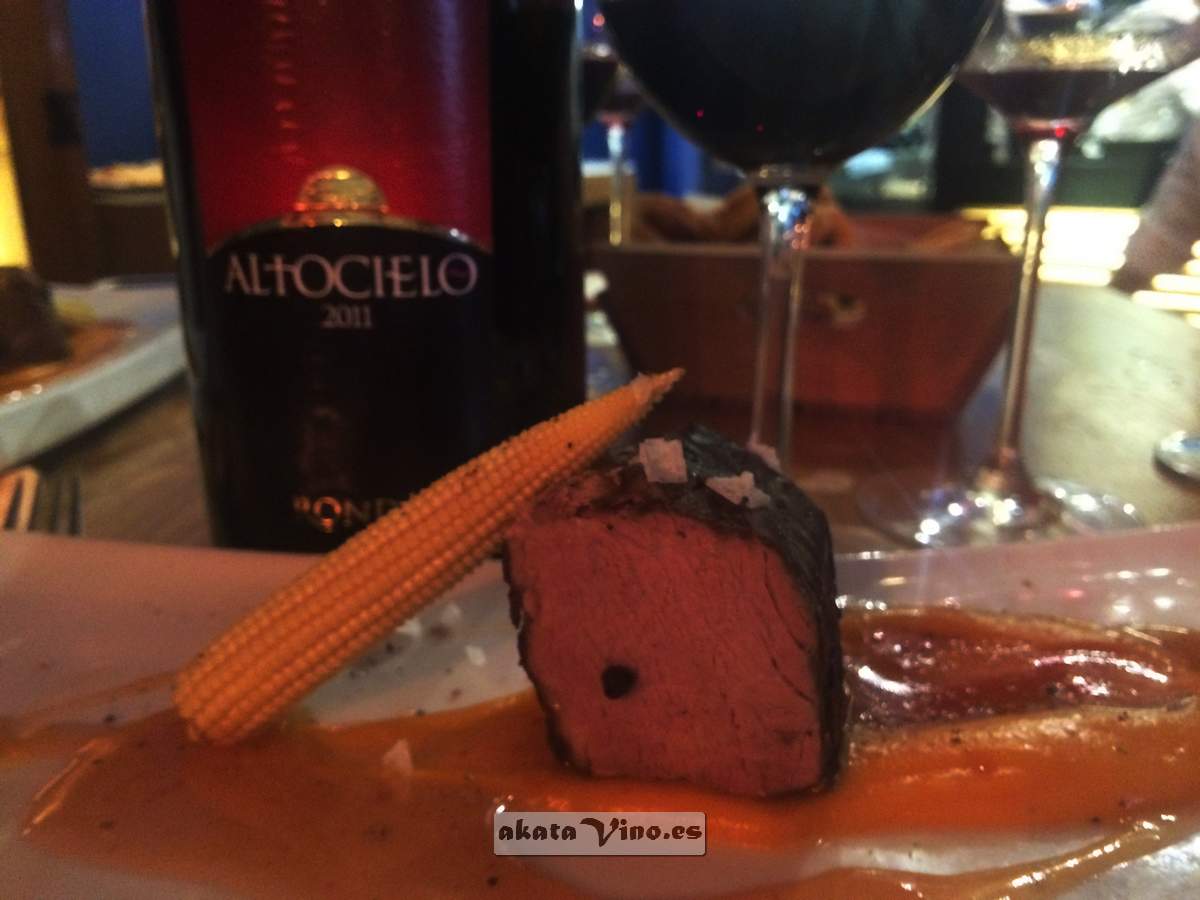 En esta ocasión podríamos decir que queríamos en mesa ALTOCIELO en formato Magnum 2011 e unirle un plato, y no como en los anteriores, que mandaba la cocina y Dom Antonio le ha buscado la mejor versión para establecer la sintonía perfecta. Pero es que además el plato ha sido de aquellos que dices PERFECTO, un lomo de presa ibérica cocinado al horno a baja temperatura durante 10 horas con una salsa/crema de calabaza y ciruela amarilla.