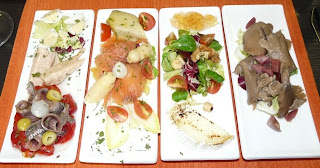 Continuamos con un repertorio de ensaladas en tapas, donde se entremezclaban cardos, queso de cabra, salmón, bonito, anchoas, todos en su perfecto equilibrio de sabor y texturas, aportando sus propias sensaciones y conjuntando el resto de ingredientes, de la presentación hablo nuevamente en maýusculas, simplemente excelente.