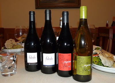 Laura cocinó un fabuloso pastel de cebolla con base de hojaldre. Armonizó a la perfección con Reposo Blanco 2007, donde la nariz destacan el dulzor de la Moscatel y la frescura y toque ácido de la Gewüsrzrtaminer, no así en boca, donde la Chardonnay toma el nombre.El pastel suaviza la acidez que aporta el vino y dotando de una grata cremosidad al conjunto. Se consigue así una armonía equilibrada de sabores y sensaciones, a la vez frescas y cremosas, dulces y saladas, que permiten disfrutar plenamente del plato y del vino.La cena continuó con una ensalada templada con pavo aderezado thai y vinagreta de dos salsas “mostaza amarilla y mostaza verde”. Armonizó con Reposo Tinto 2006 con una presentación en la que destaca una botella de formato especial, de líneas suaves, con perfil moderno y una etiqueta de estilo jovial y desenfadado, este vino parece anunciar ya antes del descorche su loable intención de haber sido concebido para satisfacer los gustos de paladares jóvenes, si bien exigentes; o quizás de entusiastas de la frescura, la chispa, las sensaciones frutales y de inmediata evocación placentera, de la alegría de beber el fruto más cercano a la vid y a la vez más franco con el terruño.