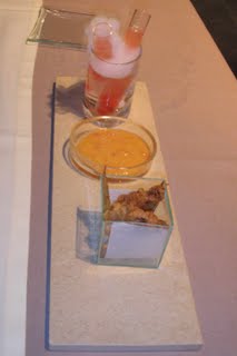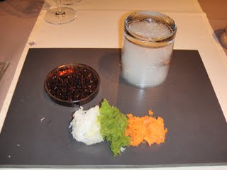 Empezamos con los dos aperitivos: coctel margarita con esferas de fresa, chanquetes y puntillas combinados con mojo de curri. El coctel servido en una especie de tubo de ensayo enfríado con hielo seco.