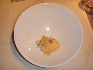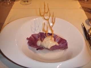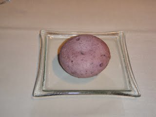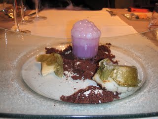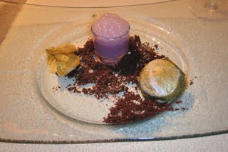 Continuamos con ESPUMA DE OSTRAS EN SU CONCHA DE PATATA VIOLETA SOBRE UNA BASE DE CHAMPAGNE Y CRUJIENTE DE LIMÓN.