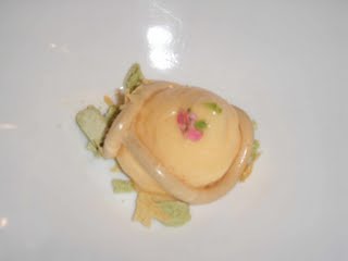 PREPOSTRE. Que combinaba sorbete de frambuesa, cava y pimienta rosa sobre una crema de higos chumbo y canela con espuma de arandanos
