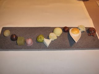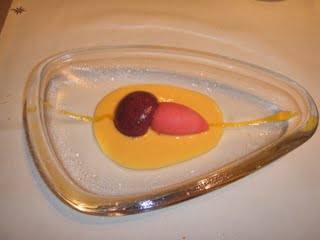 Globos esféricos de fruta de la pasión con cordones de foie y tiza de manzana. Aquí la presencia del foie era simbólica ya que era enmascarada por la fuerza aromática de la fruta de la pasión