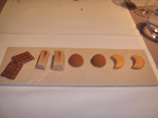 y unos dulces para acabar la cena. Esta vez era una versión de los mazapanes y polvorones, dulces típicos navideños en mi opinión cada vez más sufridos y menos apetecibles, en la que en este caso se le ha dado un toque más moderno. También una mini tableta de chocolate.