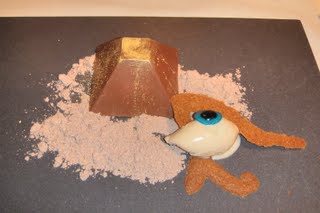 Un divertido postre que recreaba un escenario egipcio con una piramide de chocolate y el ojo de osiris en forma de helado de té.