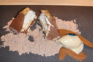 PIRÁMIDE DE NUBE DE TURRÓN, ESPONJADO DE CHOCOLATE BLANCO Y RON MATUSALÉN Y GANACHE DE CHOCOLATE NEGRO CON HELADO DE TÉ DE NAVIDAD acompañado de PAN DE TURRÓN.