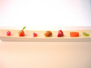 -Contrastes de Aguasal. Consiste en una serie de verduras diminutas acompañados de una serie de aliños que pretenden recordar a las verduras encurtidas. Original y vistoso, sobre todo el concepto de tener que comerlas con pinzas.