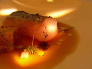 El higado de pato se cuece dentro del barro durante no demasiado tiempo y con una humedad determinada, quedando bastante desgrasado. Una preparación diferente de este producto y que consigue un resultado realmente espectacular. Lo acompañaba un suave bizcocho de remolacha, su gelatina y unos germinados. Plato que se queda, sin duda, en la memoria gustativa
