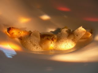 -Ostra con soda de espárragos. Este plato tenia un toque de pimienta de sechuan button, condimento que tiene la particularidad de dar una sensación entre eléctrica y anestésica y que trasfiere a este plato un toque como metálico. Personalmente prefiero las ostras que se comen de un bocado. Esta, debido a su tamaño, tenías que partirla