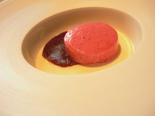 -El nubolet de azahar bañado por natillas de vainilla y sorbete de naranja sanguina. Guiño a la infancia de estre postre que traía recuerdos a las típicas nubes o 'jamones' aunque a mí casi más me supo al pastelito de 'pantera rosa' y acompañado por un refrescante Christmann Idig Auslese 2004