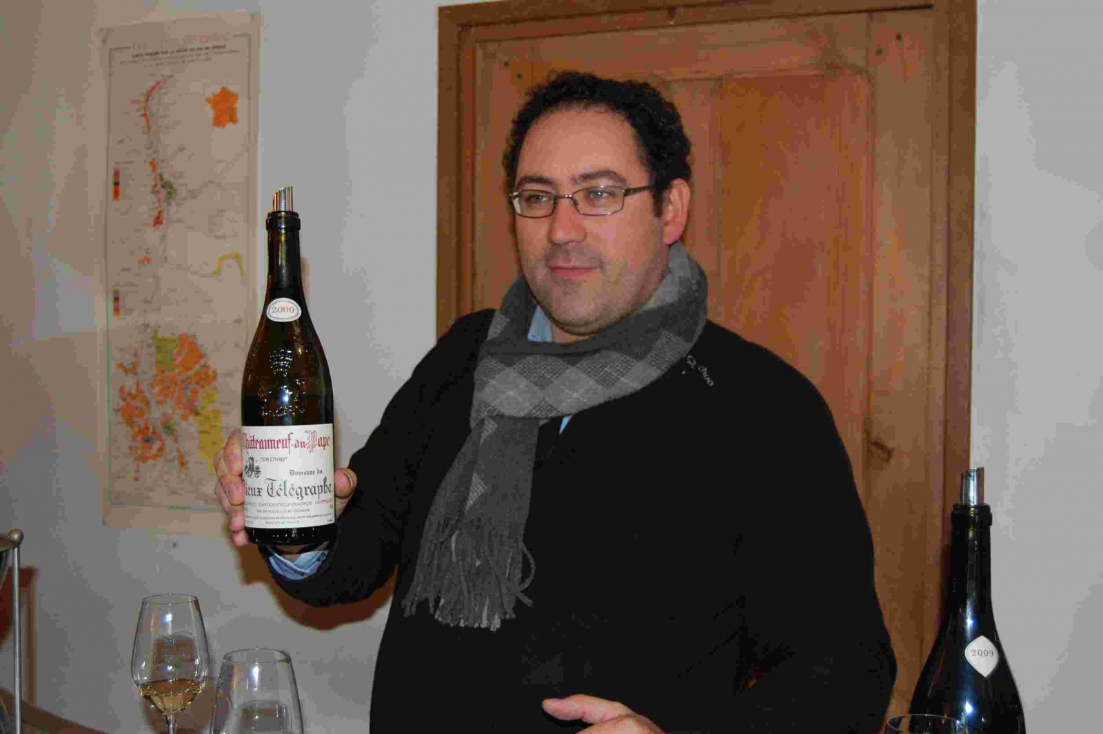 El colofón fue Domaine de Trevalon, una bodega ubicada al extremo más al sur de la Región del Rodano, en la Provenza, alejada de las zonas de mayor prestigio enológico, que en su momento se creo como rincón de descanso e inspiración de un pintor y escultor gran amigo de Pablo Picasso, cuyo hijo Eloi Dürbach decidió allá por el año 1973 plantar hasta 20 ha de viñedo extendidas en pequeñas parcelas en las colinas que rodean la casa. Hoy en día Eloy sigue al frente de la próspera y reconocida bodega que ha conseguido crear, aunque ya es el hijo de éste el que se ha hecho cargo de la dirección técnica de la bodega. Cuando menos se trata de un elaborador y de unos vinos con una gran personalidad, distintos, originales, elaborados con un coupage muy particular y poco habitual, Cabernet Sauvignon y Syrah al 50 %. De la cata de sus vinos puedo decir que me gustaron los blancos elaborados con rousanne y marsanne principalmente y poquito de chardonnay. Curiosamente me parecieron los más frescos de cuantos probamos en todo el Ródano, a pesar de ser los más sureños. En cuanto a los tintos me parecieron muy interesantes las muestras de barrica de catamos de 2009 tanto de syrah como de cabernet (vinifican por separado) pero sin embargo me costó entender su 2008 ya ensamblado y embotellado, así como el 2001. Concluimos que encontrábamos un cambio de tendencia en la elaboración, diferencias entre vinos diseñados por Eloy y los que ahora está haciendo su hijo, el tiempo nos dará o quitará la razón.