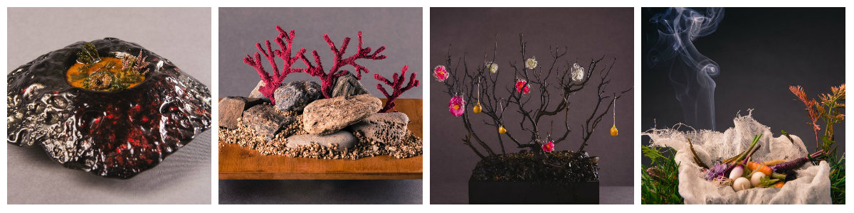 La sucesión de platos continúa con exquisiteces como un Chawan-Mushi, un Niguiri de vieira, Tartar de cerdo ibérico, Sashimi de caballa, Gumkan de corazón de atún, Tempura de alga codium, Nigiri de unagi kabayaki o Gyoza de cochinillo, entre otros. Y se remata la velada con originales postres donde Filippetti vuelve a sacar su lado más artístico en instalaciones gustativas como un espectacular Fondo Marino y un creativo Árbol de petit fours, con estética a lo Tim Burton, del que cuelgan coloridas creaciones dulces, como caramelos Begoña o crisálidas de algodón de azúcar con hojas aromáticas.