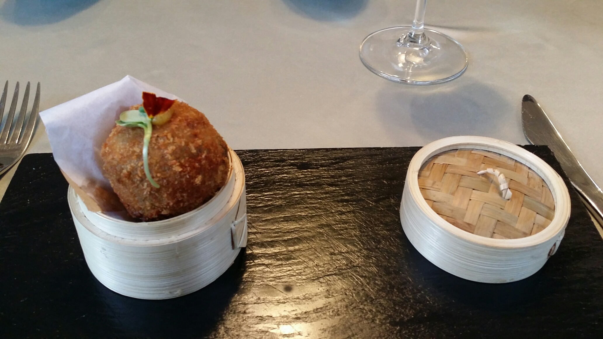 Crujientes, compactas por fuera , melosas por dentro. Demostración del juego de texturas llevadas al limite. Dura por fuera, fibrosa por el rabo de toro , melosa en la unión. Cuando rompes la croqueta , el sabor y el olor te inunda la boca. Suavidad y contundencia.
