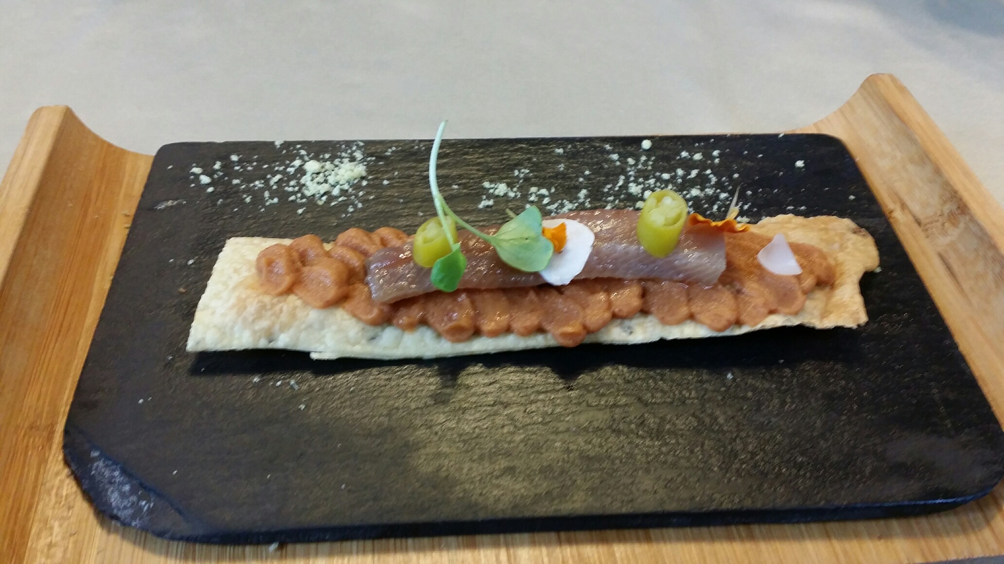 Sabor muy alto de la sardina , al principio salino, luego ahumado, barnizado y envuelto por el humus con punto de acidez . En un solo bocado , cuatro sabores escalonados y nítidos. Humus nada empalagoso, terreo, pero suave. Unión de tierra y mar con sabor alto , expansivo (en la boca va del centro hacia fuera) , acabando suave y fresco.