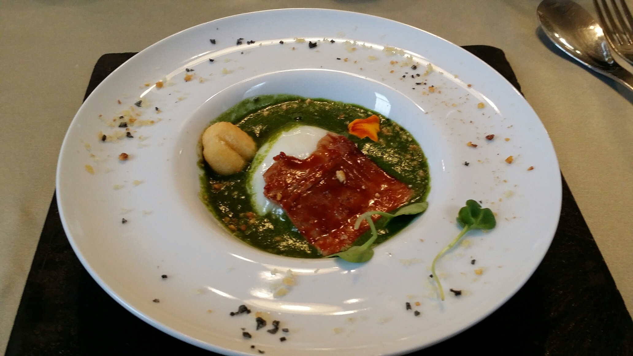Espuma de espinacas con huevo poche y panceta Gallega