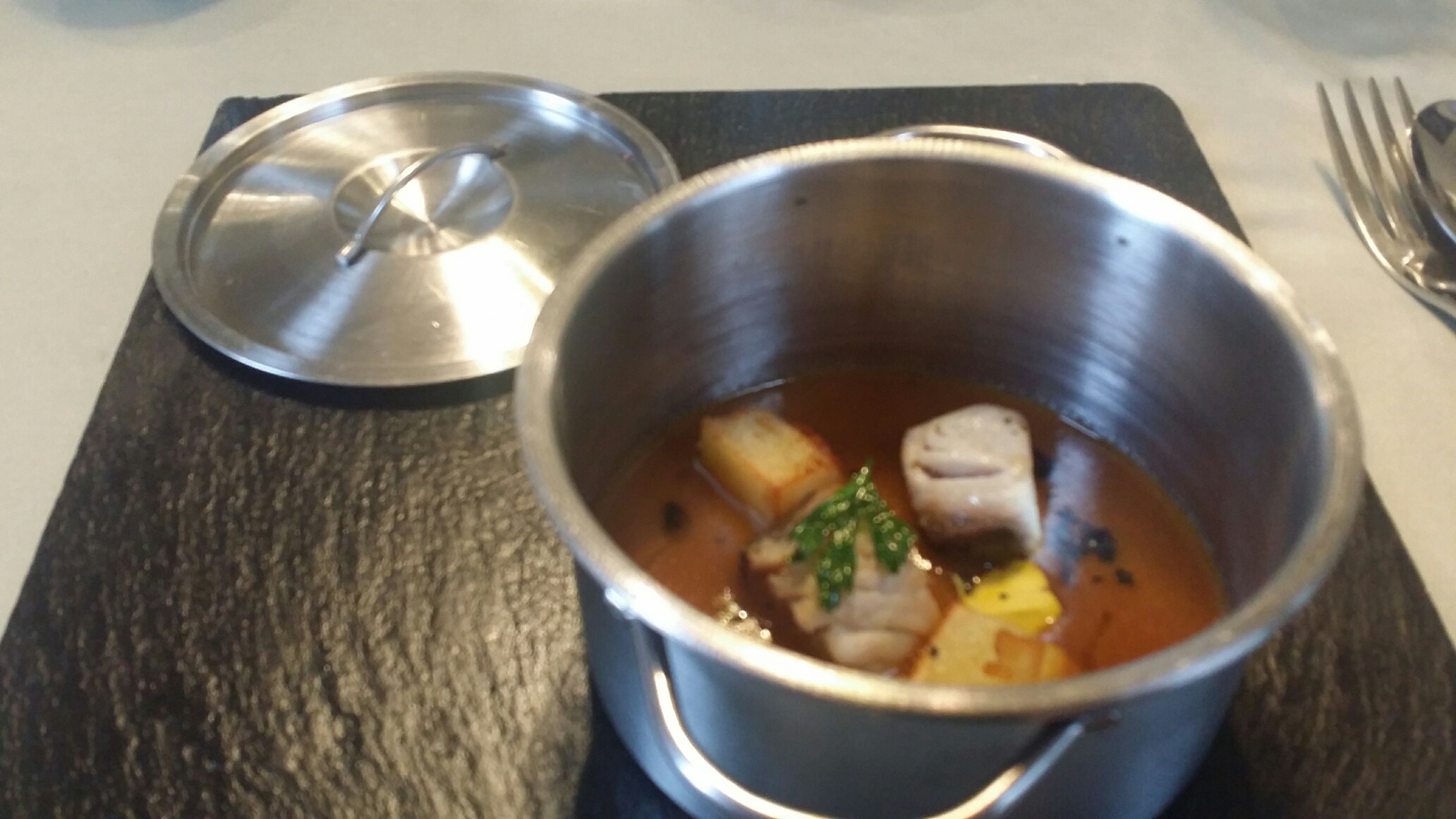 Consta de tres partes: patatas, fondo y bonito. Aquí la duda es que es lo que esta más bueno. La patata por si misma , es un plato, cortada a dos , marcada , sellada con capa crujiente, esponjosa por dentro. Al morder se abre con potencia , como si se liberase de la cárcel que es la superficie. Misma técnica, misma sensación con el bonito. Al romper la capa de fuera entra con fuerza ese sabor típico de mar con grasa infiltrada. Y el fondo………El fondo , palabra mayor. Para mojar y mojar. Perfecto en consistencia , ni pesado ni ligero , de sabor lineal y un final picante que aumenta poco a poco fijando se a las papilas y desaparece lentamente.