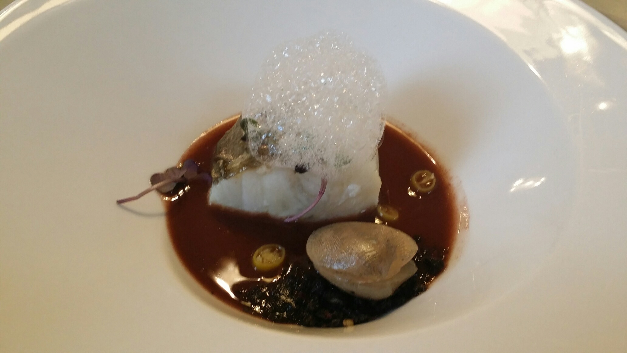 Bacalao con caldo de humus, pan de sepia y almeja gelificada
