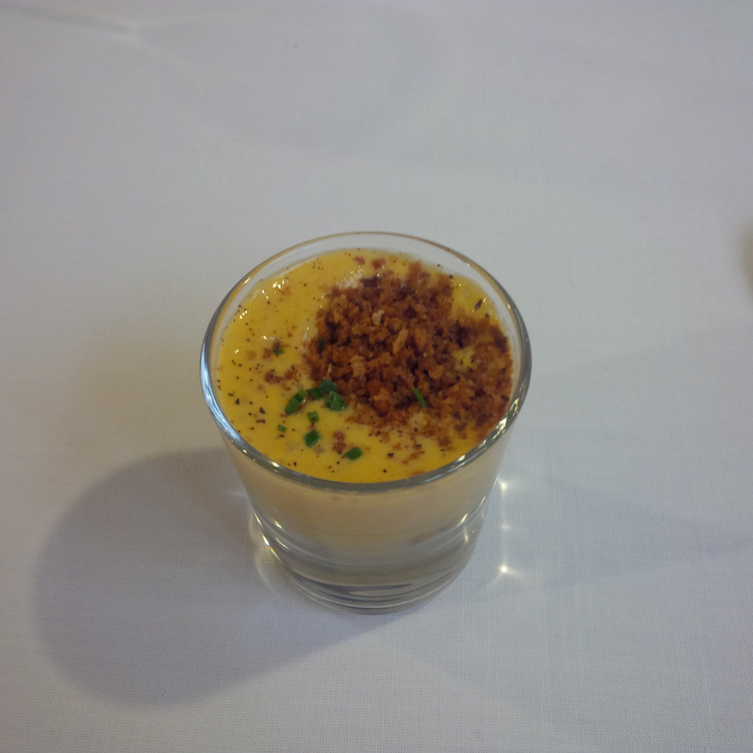 Presentación muy original. Cremosa con crujiente servida en un vaso pequeño. Punto justo de textura . Sabor alto, primero se nota la merluza, luego la gamba, con postgusto largo. Para comerte muchos vasitos