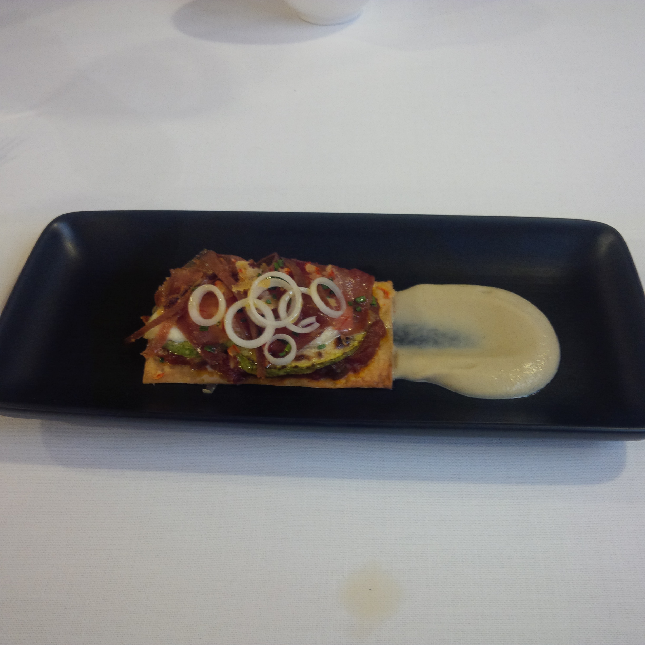 Excelente combinación del pisto en la base con el queso. La acidez limpia la grasa y facilita el potente sabor del salazón. La crema de la berenjena remata el final con sabor ahumado. Muy buena la combinación de todos los sabores , sobre una base de coca crujiente . Plato sencillo en concepción , pero muy ejecutado y presentado. Es un ejemplo claro de cómo se pueden jugar diferentes gustos sin ningún tipo de alarde
