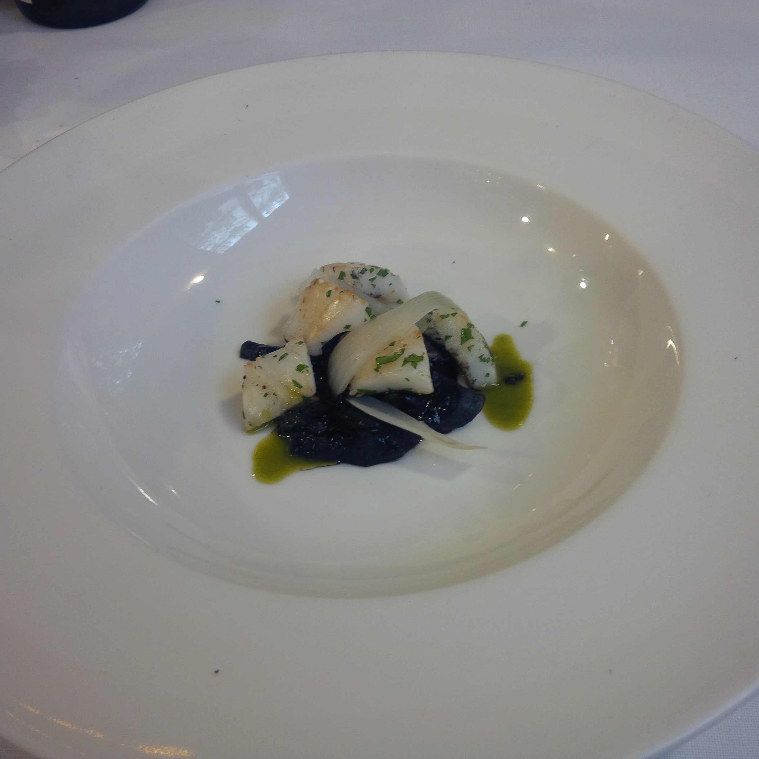 Perfecta la cocción de la sepia. Se repite otra vez la combinación de los sabores , dando protagonismo a la sepia bruta, la cual es introducida por la limpia y le permite ser protagonista de la explosión final. Sabor profundo y duradero