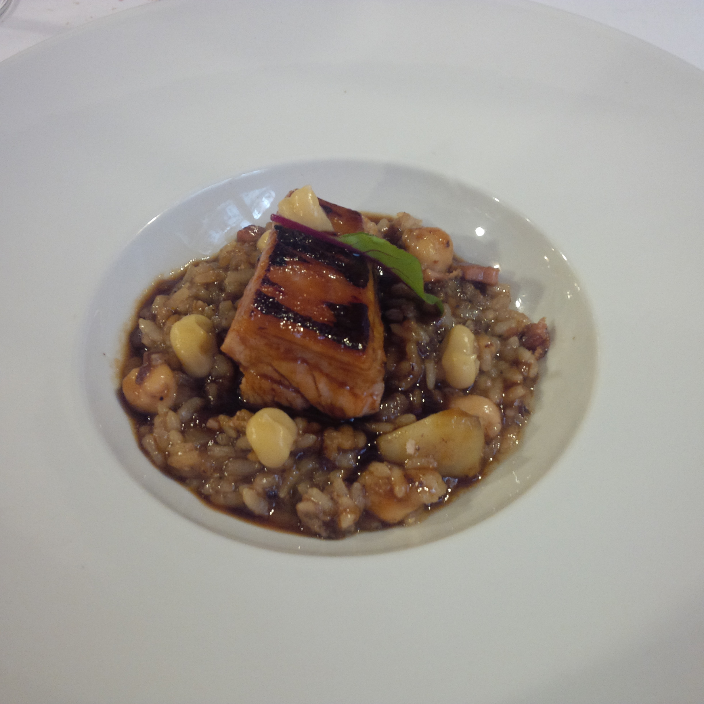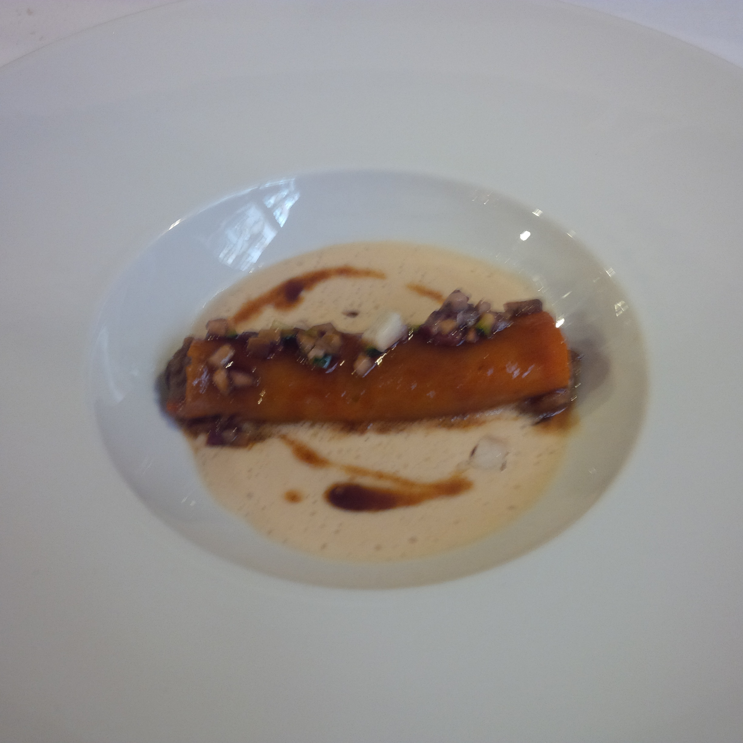 Original en el planteamiento y , bajo mi punto de vista arriesgado, ya que la calabaza podría quedar eclipsada por el resto. No es así. Aunque lo primero que muerdes es la superficie del canelón, ésta deja paso rápidamente al cerdo . En ese instante el rey es el cerdo, más tarde aparece discretamente la anguila con punto justo de ahumado que llena la boca, para dar paso a ese fondo algo dulce de la calabaza. La crema de jamón ayuda a que el conjunto sea fluido y ligero en textura. En mi opinión, tal vez hiciera falta un poco mas de potencia a la crema, no en su consistencia (perfecta) , pero si en su sabor. También es verdad que, a lo mejor, esa potencia no le gustaría a mucha gente. En cualquier caso , plato sorprendente y que sin dudad merece y, mucho, la pena
