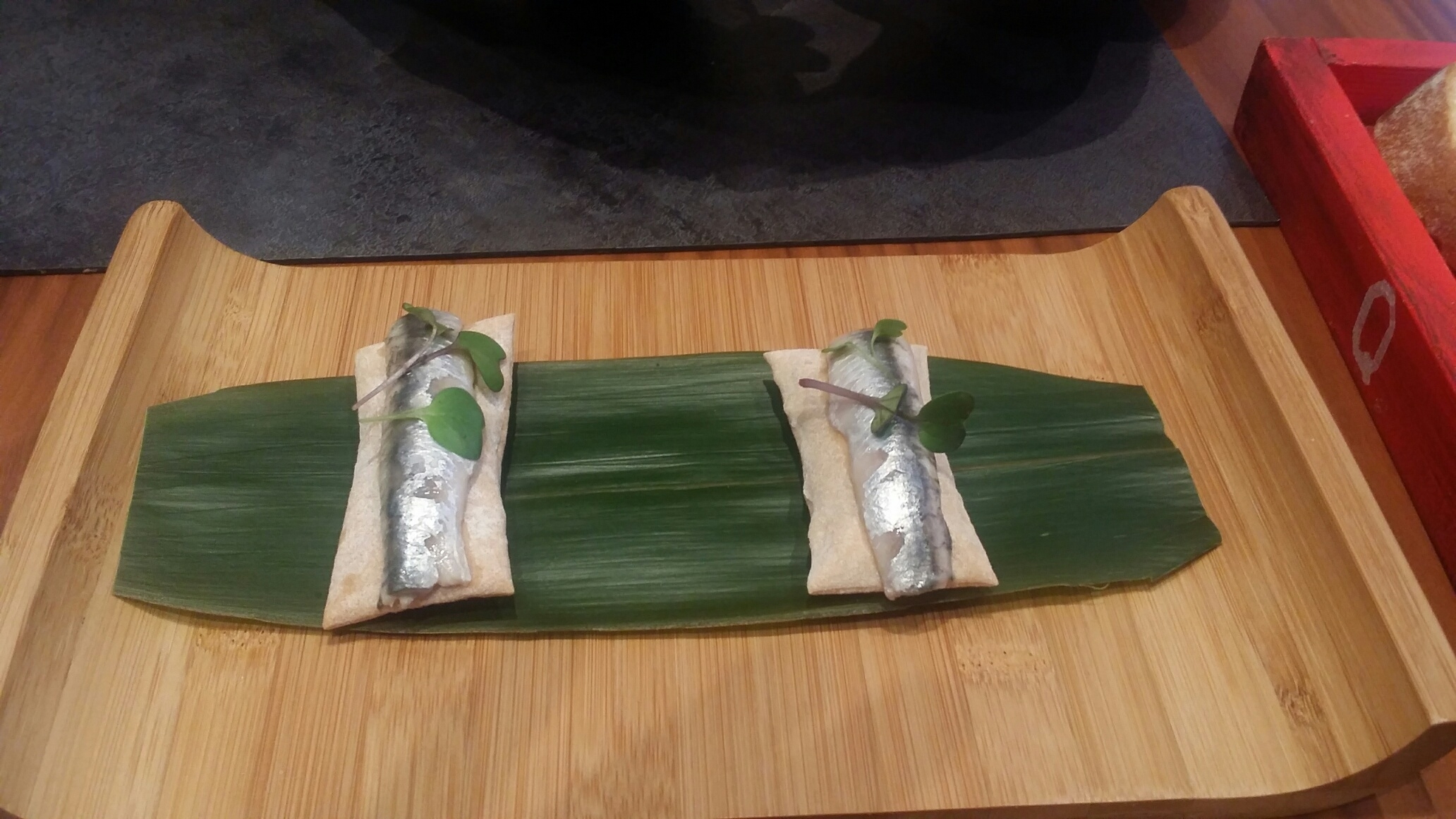 Excelente conjunción de sabores y de texturas. Muerdes el boquerón , rompes el pan y aparece la salinidad del pescado que se mezcla con la acidez del tomate. Textura