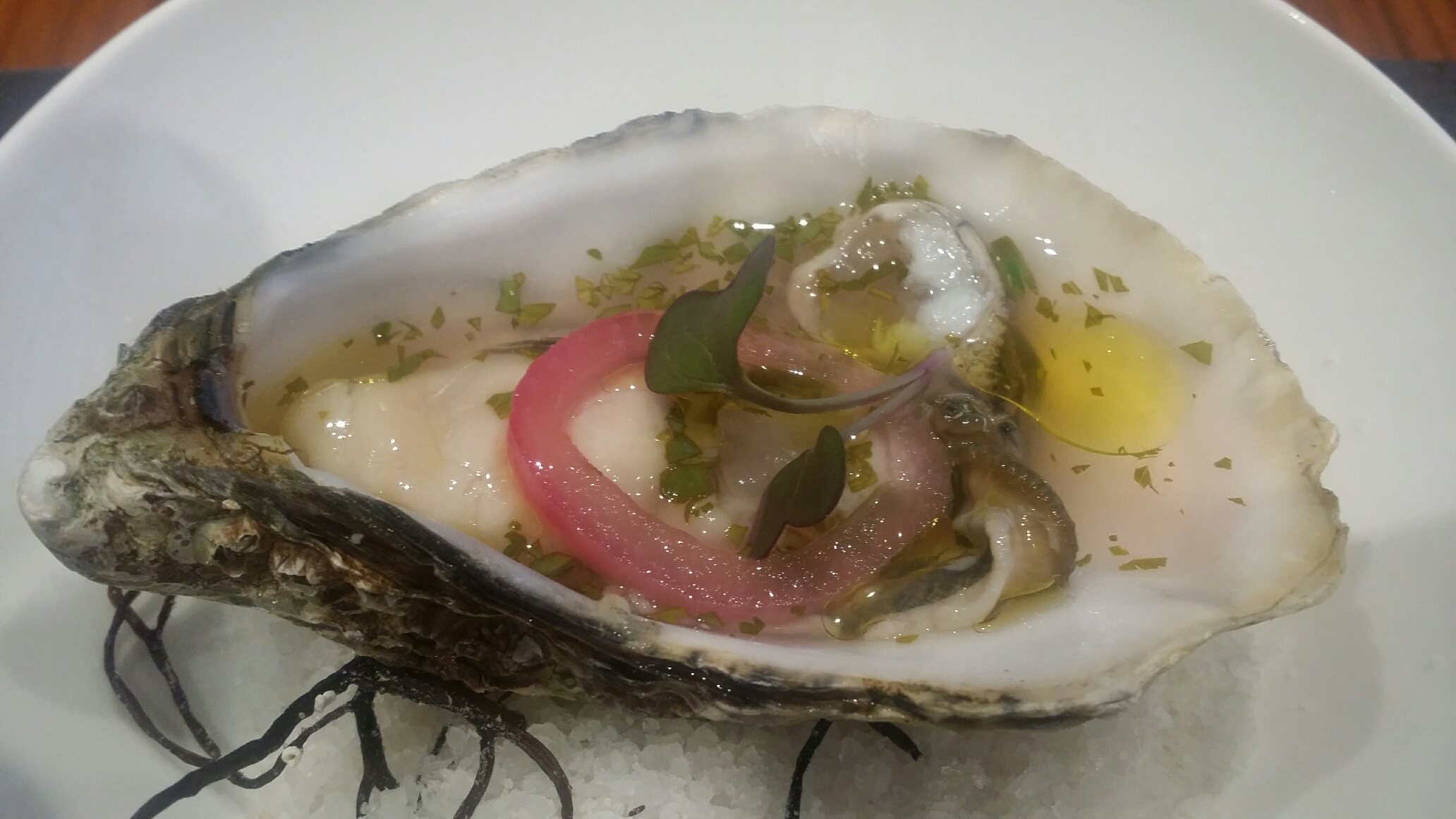 Ostra de buen tamaño y de sabor alto. El ceviche aporta el contrapunto justo a la potencia de la ostra. No resta sabor , lo aumenta si cabe , pero el final es Frescura