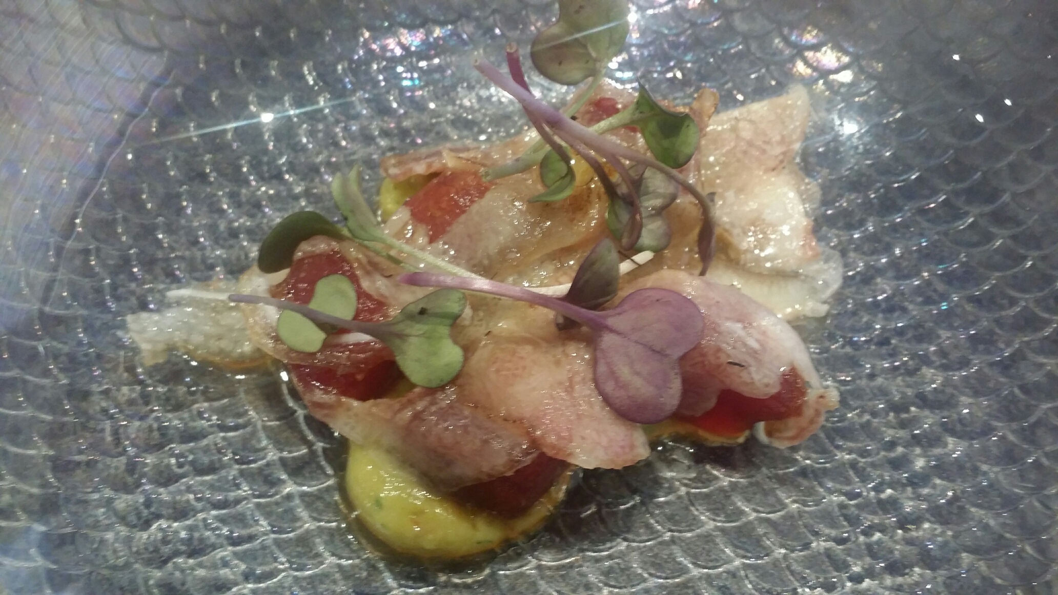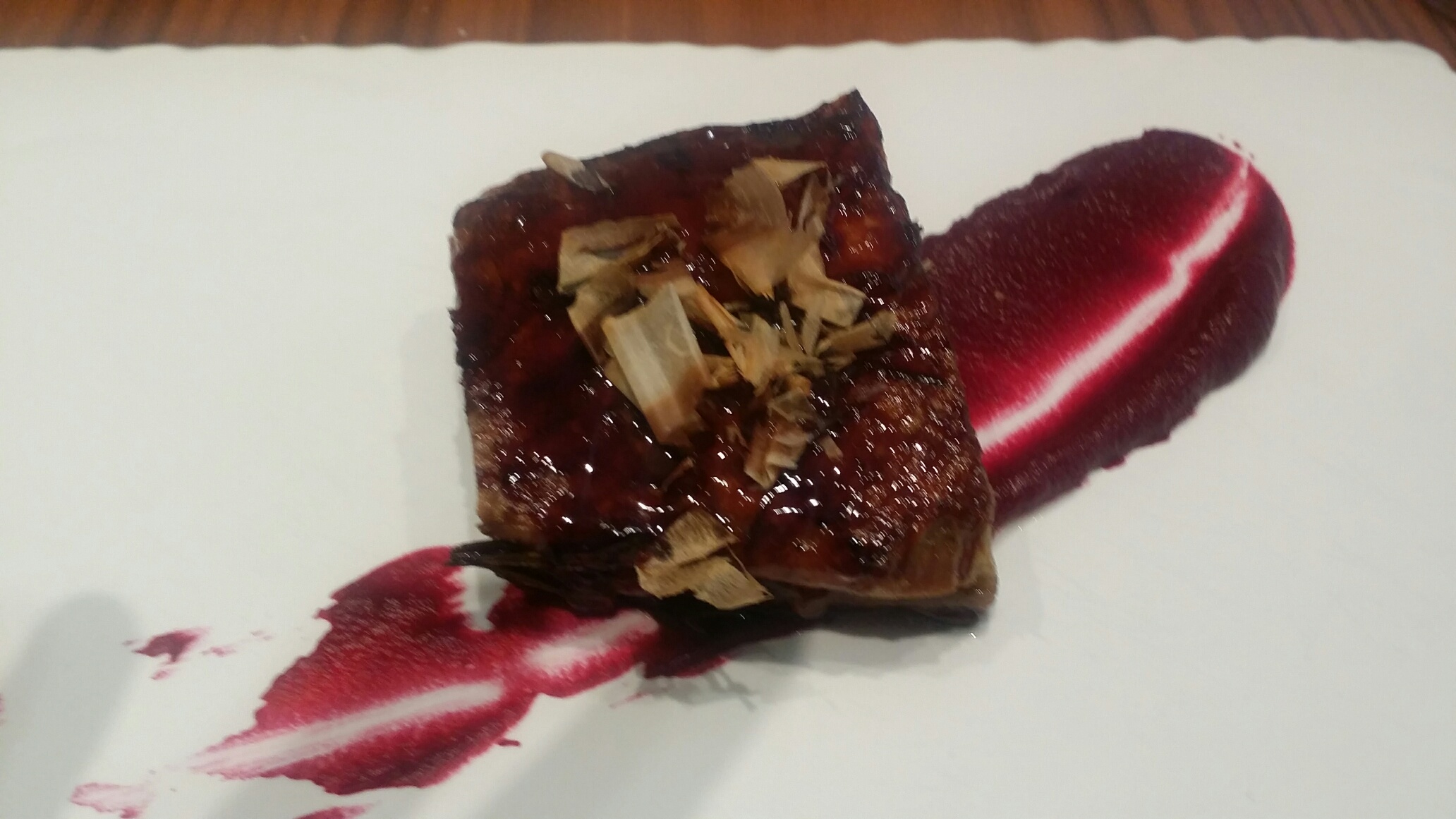 Atún perfecto en sabor y en contenido graso, la panceta con toque ahumado profundo y largo, el guacamole ligero y nada pastoso. En la boca rueda de sabores con marcada sensación ahumada al final. Dados los ingredientes , a priori, es difícil que este plato no quede empalagoso. Nada mas lejos , ligereza , melosidad y firmeza. Sorpresa