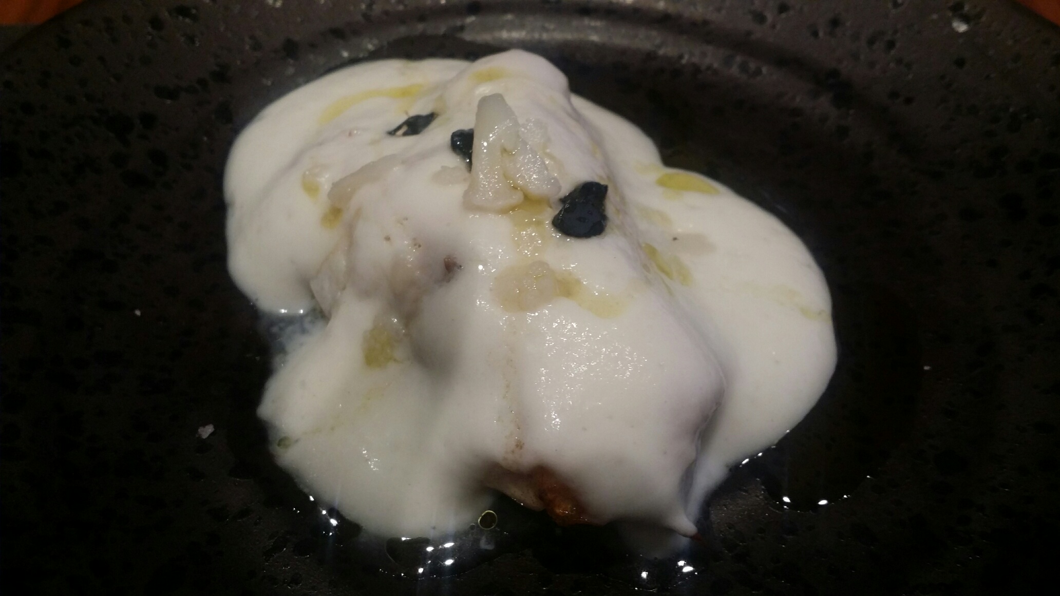 Cocochas de bacalao con espuma de coliflor y ajo negro
