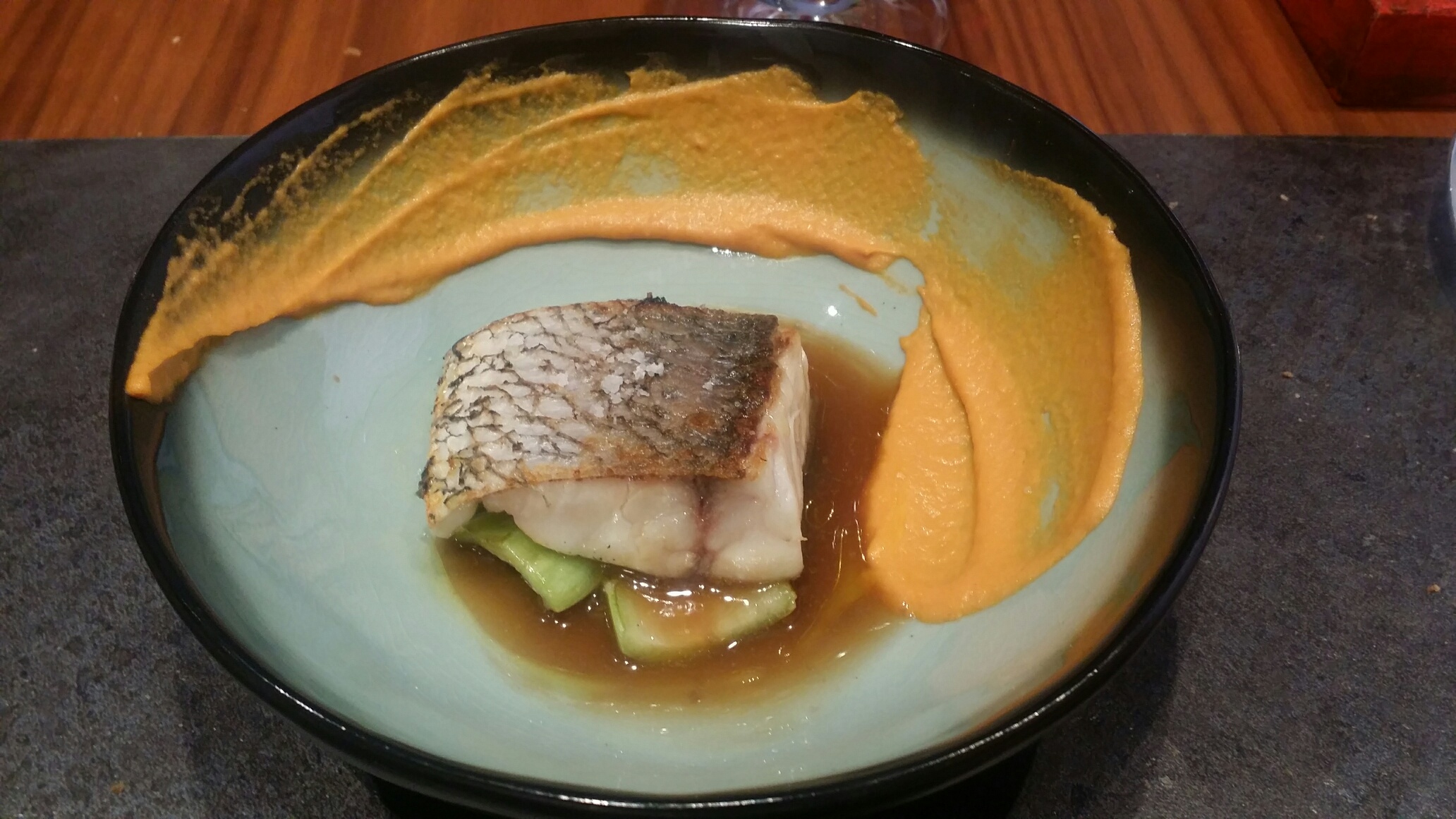 Otra vez cocción perfecta del pescado. En su punto de firmeza y de sabor. El caldo lo envuelve , casi lo protege y sirve como introductor del sabor del mar, el cual se mezcla con el oriental y el toque final de la romescu. Delicadeza