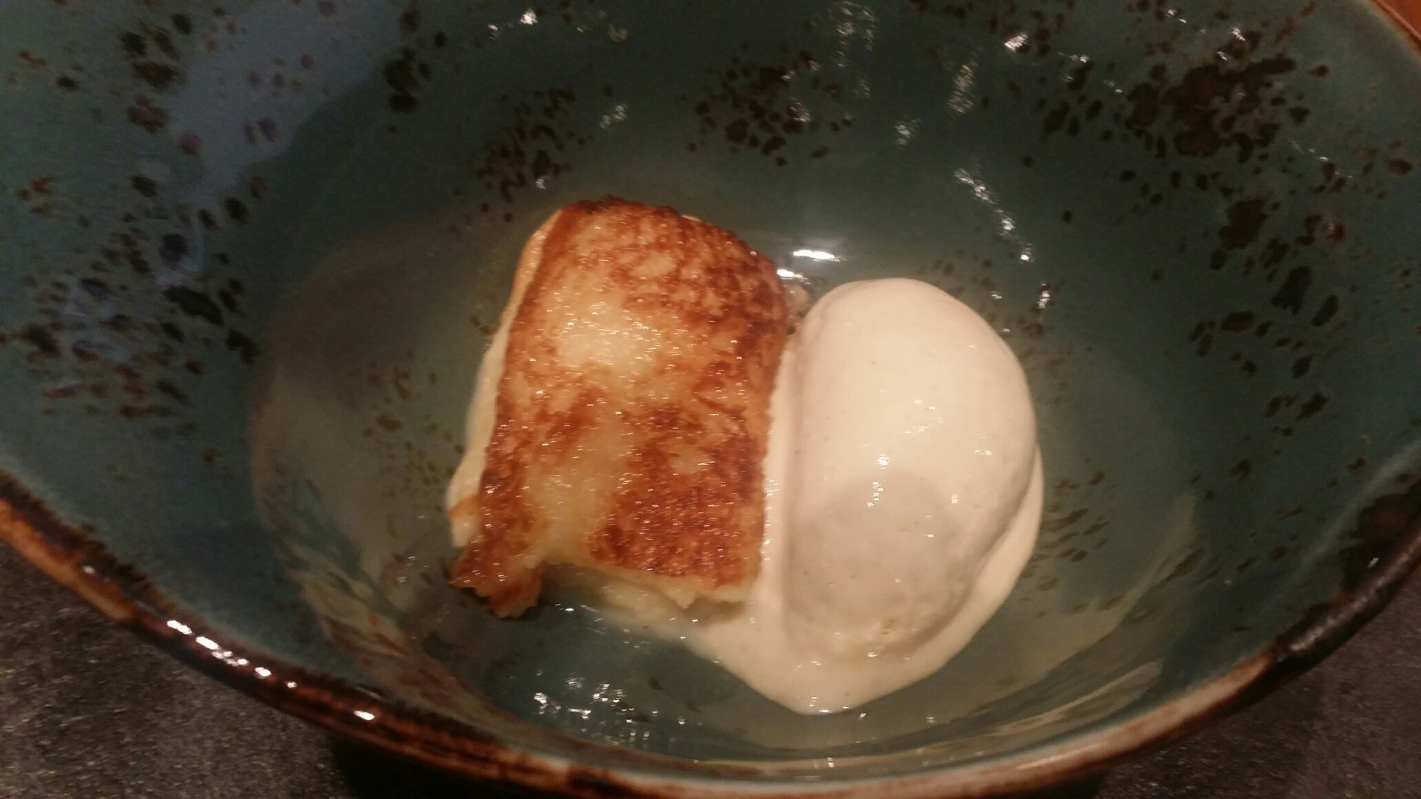 Conjunción, conjunción, y más conjunción. No sé si el helado acompaña a la torrija o la torrija acompaña al helado. Dulzura justa con aporte de la especie milimétrica. Lo dicho, Conjunción…..