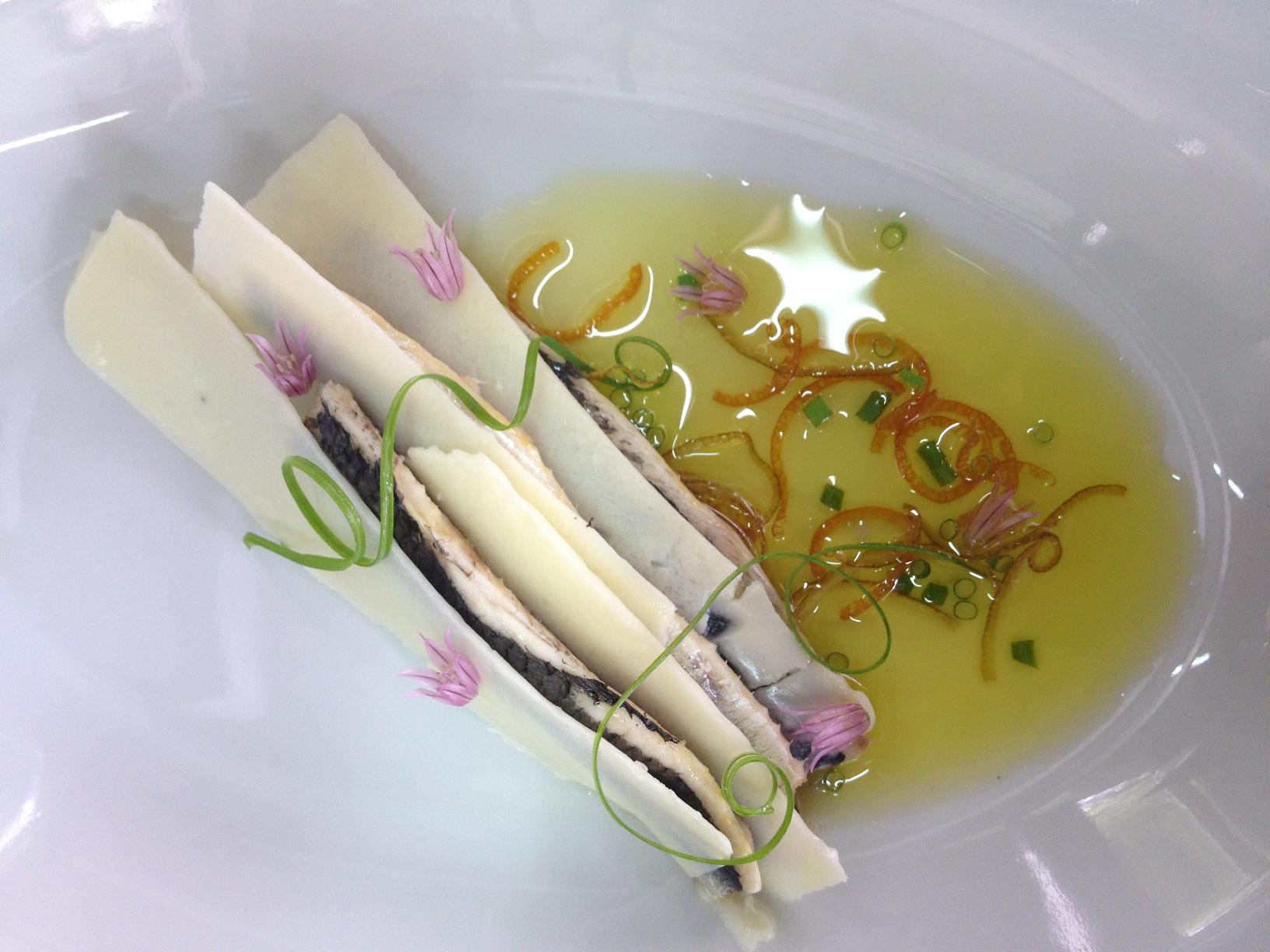El concepto de esta elaboración, es el de una ensalada sin lechugas, rebajando la potencia de los cítricos de la cocción de los bocartes con las grasas.