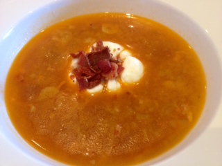 - Sopa castellana con huevo poché y crujiente de jamón.