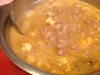 Alubia de judía Garrafal Oro: Procedente de las judías plantadas en verano, recogidas secas y tipo pocha fueron congeladas. En esta ocasión se han cocinado como las pochas con unos langostinos. Un poco más mantecosa que las pochas. La salsa es más espesa que la de las pochas.