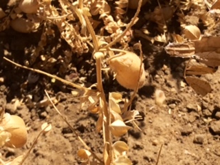 Sobre estas lineas, un garbanzo seco listo para cosechar y en la zona superior izquierda, una planta aún muy verde.