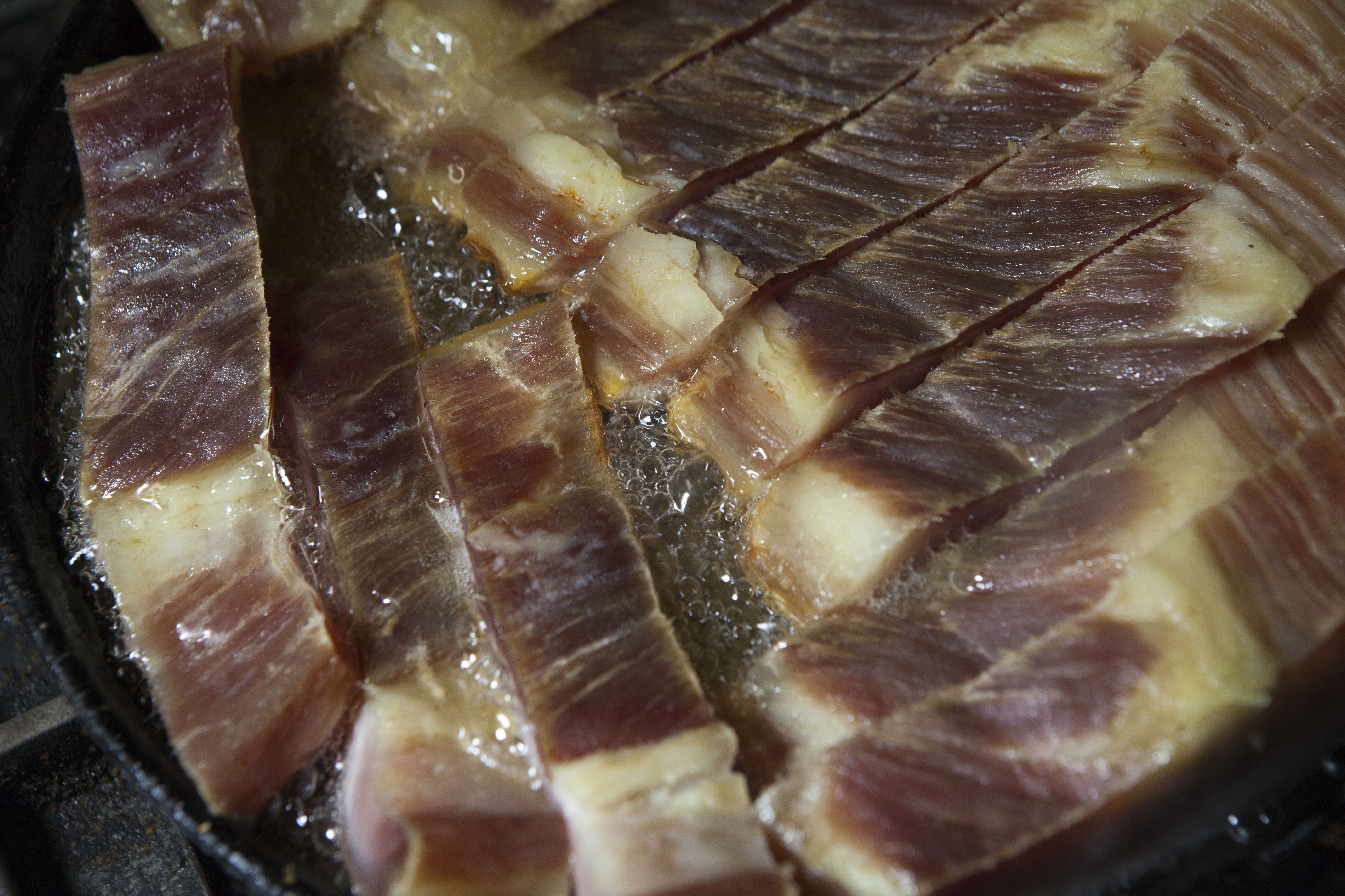 Se cortan tiras de panceta de 1,5 cm aproximadamente y se colocan ‘de pie’ en la sartén, unas junto a otras, con la piel hacia abajo. Es importante que el fuego sea muy suave, para que la corteza se vaya hinchando y luego quede crujiente.