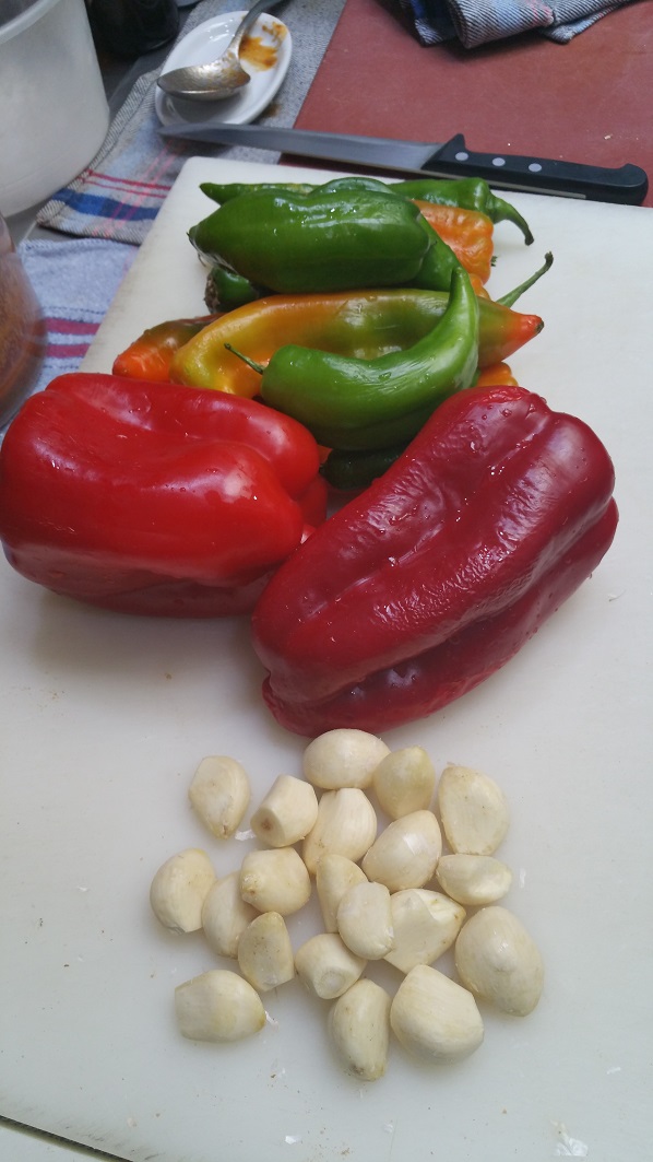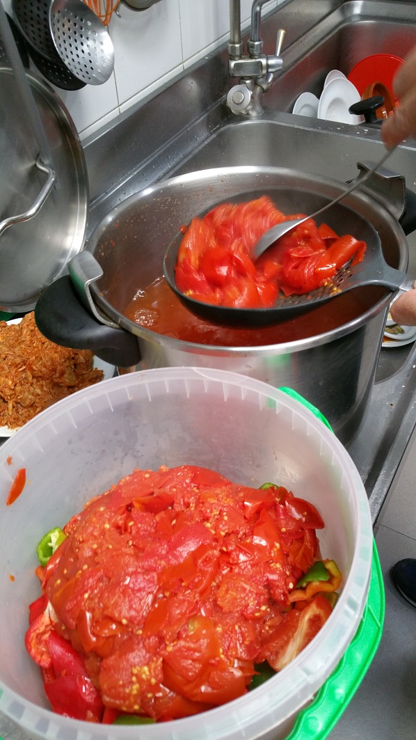 Cocer los tomates en olla rápida 25 minutos mientras tanto trocear los pimientos los ajos añadir la sal. Una vez cocidos los tomates añadirlos a los ingredientes anteriores y pasar por la batidora hasta conseguir que quede líquido. Apartar en agua de haber cocido los tomates y calentar hasta hervir el agua.