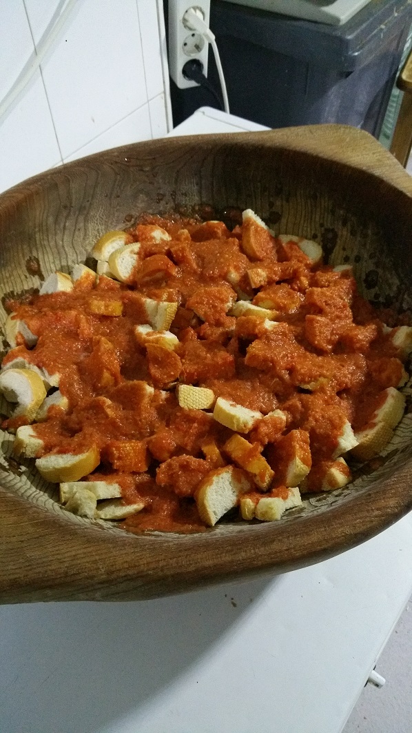 Añadir la mitad del pan al lebrillo y agregarle la mitad del líquido resultante de los tomates los pimientos.