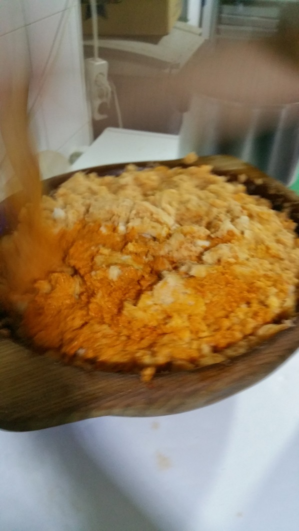 Una vez añadido casi toda el agua majar hasta conseguir la textura idónea. Tapar con una manta y dejar reposar 25 minutos. Una vez pasado ese tiempo está listo para degustar.”