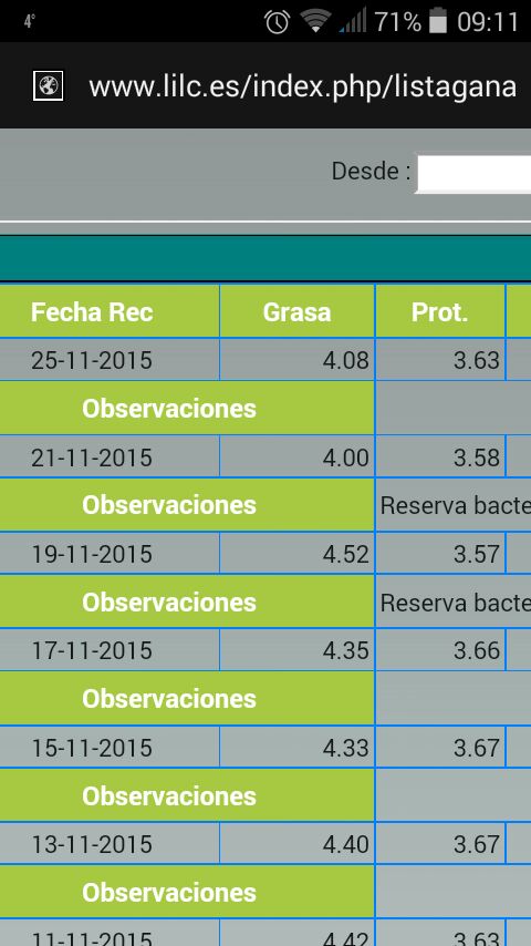 He tardado en colgar los resultados, para tener más de un ciclo lunar con sus datos los análisis de la grasa. Las cifras de las proteínas prácticamente no varían. Durante este periodo, los ganaderos me han comentado que la alimentación de las vacas ha sido similar.