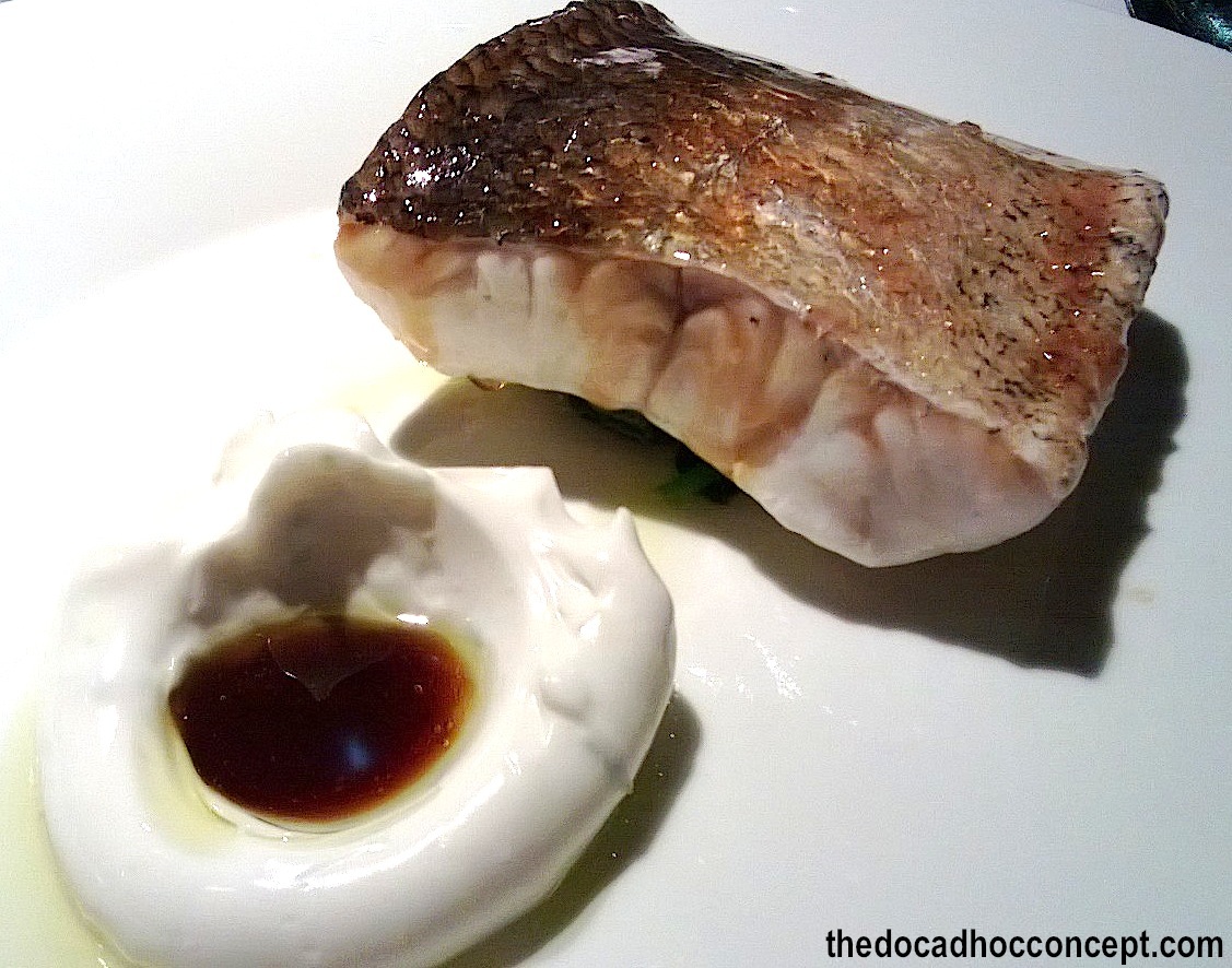 Una merluza de Burela que se cocinó a baja temperatura de 55ºC, con una base de espinacas (parecen algas) y con un blanco pil-pil lima-limón, que en su interior contiene una leve salsa Ponzu con soja de cítricos.