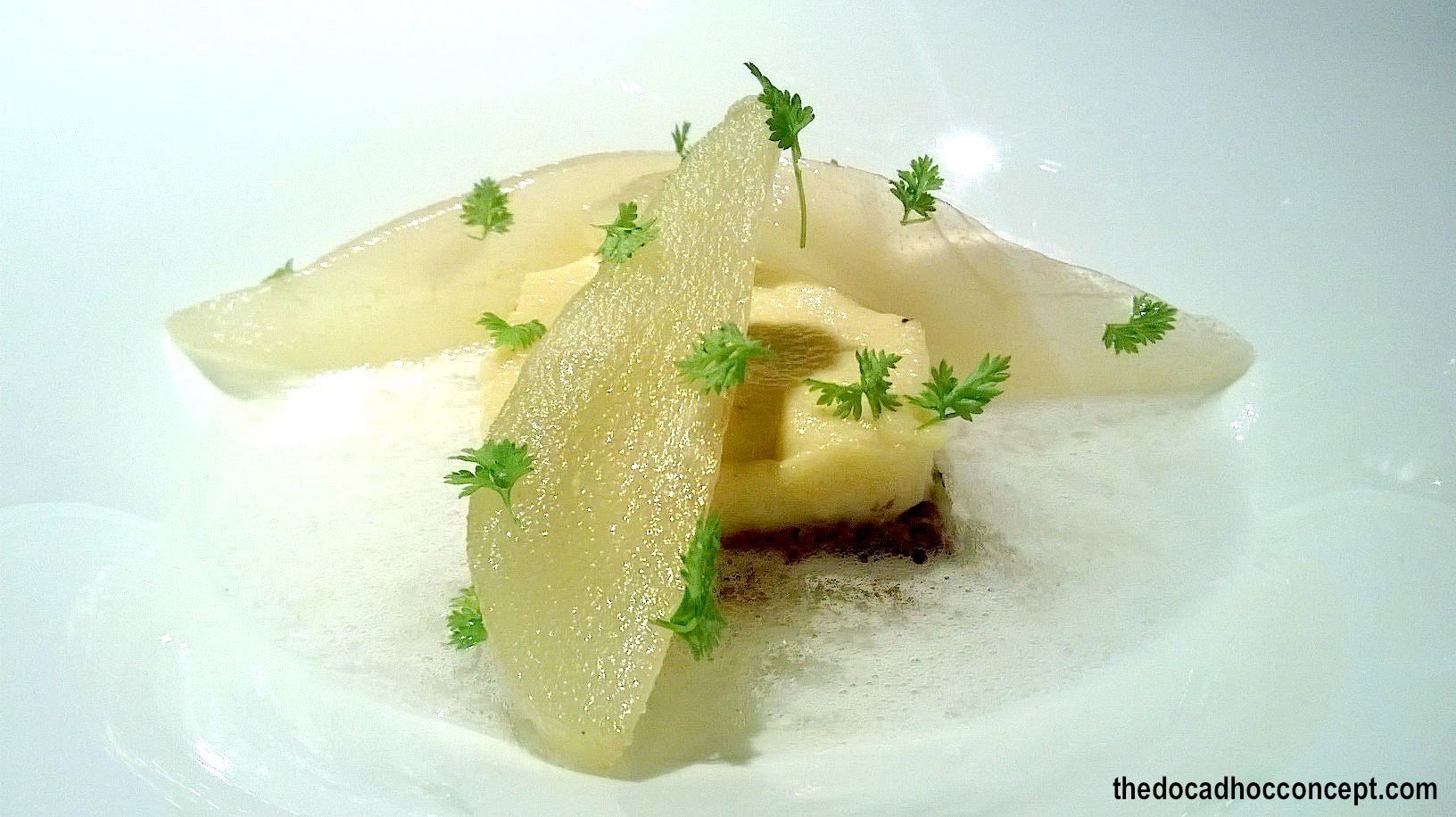 El segundo postre, muy dulce. Estamos ante unos dátiles con puré de pera y pera en almíbar, con jugo cítrico granizado. La idea es muy buena, pero no la ejecución, si bien presentado, el sabor lo hunde a mi sentir, ya que no se potencian nada los cítricos, no hay especias y la pera y los dátiles están azucarados en exceso.