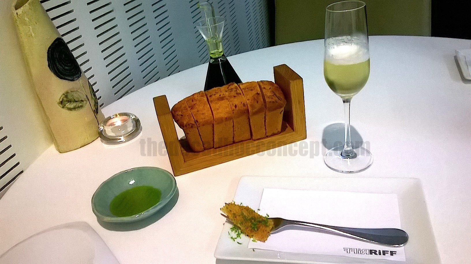 El pan casero de tomillo, sin sabores extremos, se presencia lo justo para acompañar y no llenar. Se presenta en corte tradicional, dejándolo en su sitio.
