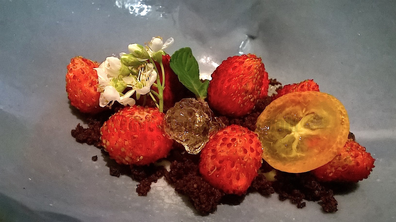 Las fresitas el gelé y su almendra y café, es un postre bueno en sabor y parecido a otro de Ricard C., que no igual. Presentación de cuento de hadas, sabor a cada producto que conjunta el moscatel en boca. Mejor postre es el limón con su rosa y lychee, sin duda un acierto al que le pudiera haber maridado un sake o un licor gallego de hierbas. El helado espectacular, y como se va fundiendo, mejora el cuadro sobremanera y además cambia de color.