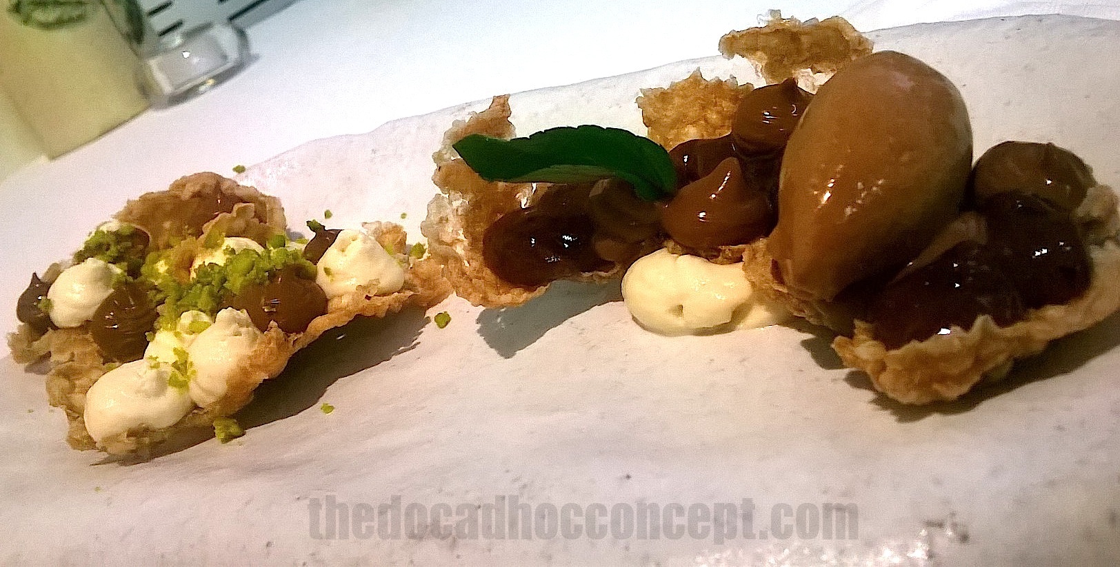 El chocolate es un plato para mejorar, ya que siendo amante del cacao, quitaría el crujiente de arroz y pondría más énfasis en la explosión del cremoso (no apto para chocoholics), para que el chocolate negro sea el protagonista, corte el fin de los platos en mesa y maride con algo con más potencia que el moscatel, como por ejemplo un Fondillon o quizá un Marsala, y también un tinto dulce.