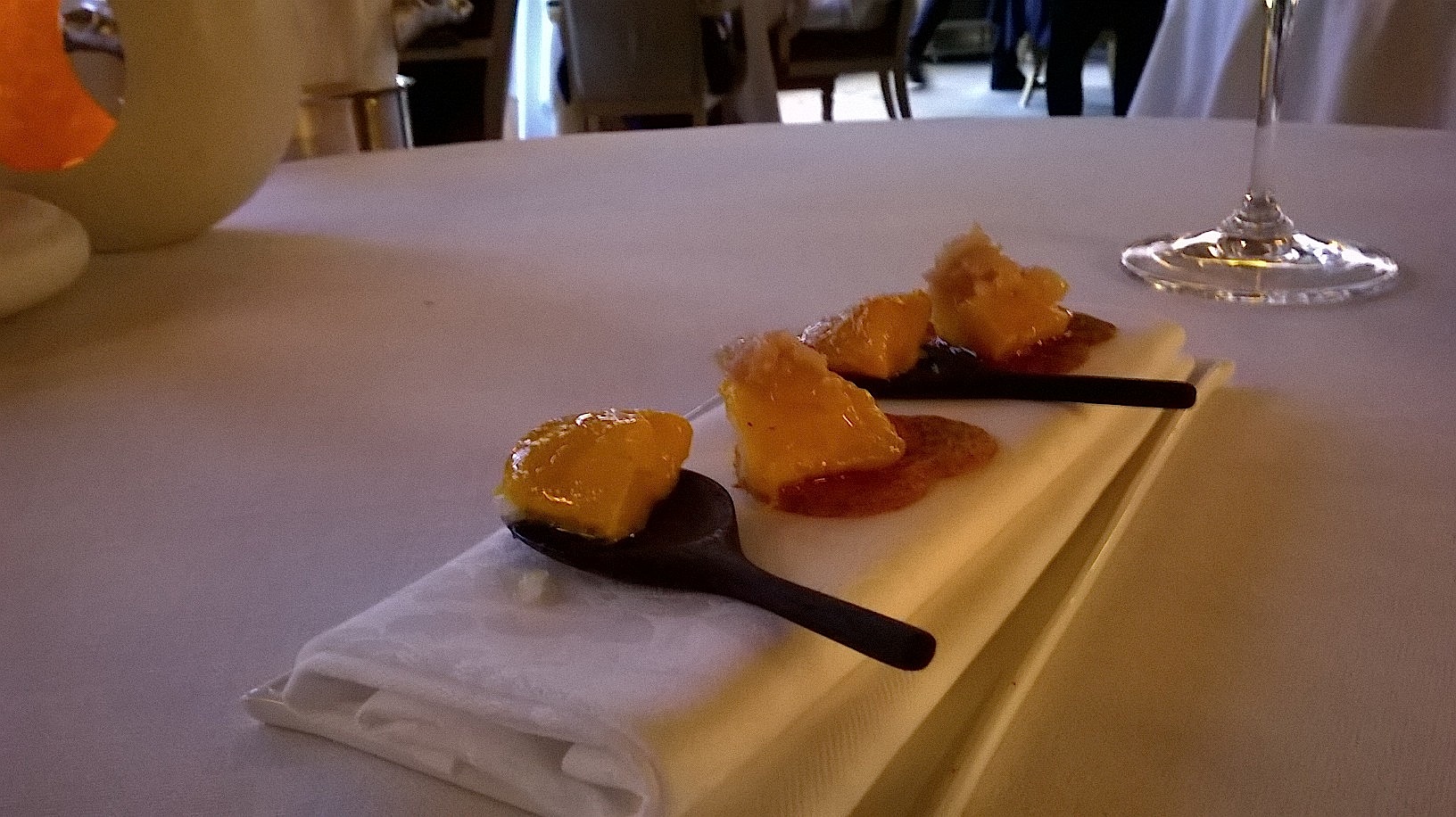 Combinación de queso en el primer pase, con ralladura y ravioli, junto a uno de los varios satélites que rodearon la cocina y los platos de Yannick. Sabores de campo, de Italia, en perfecta textura y armonía. El Foie fue de 1 minuto, nada más duró, al saber ensamblar grasa y sabores ahumados y de naranja. La textura delicada y fundente. El siguiente plato de pescado frío y caliente con setas en láminas, no emociona y creo que deben darle más sapidez (Segundo detalle de sumillería)